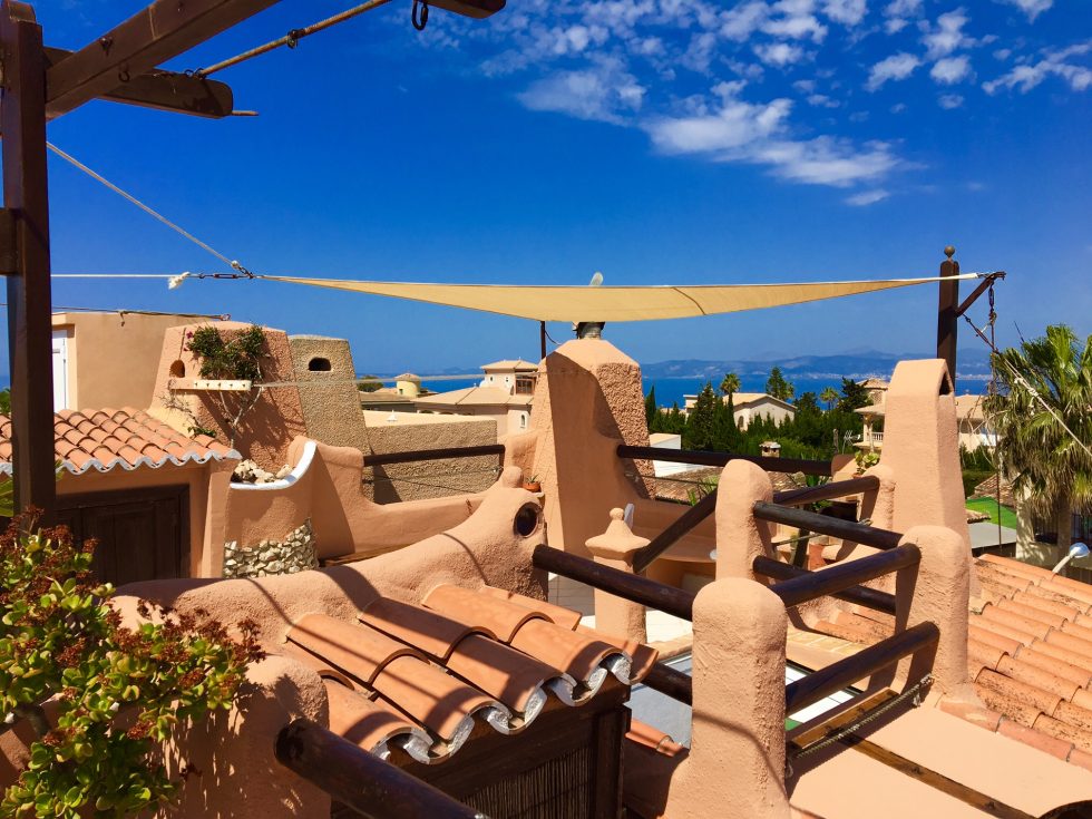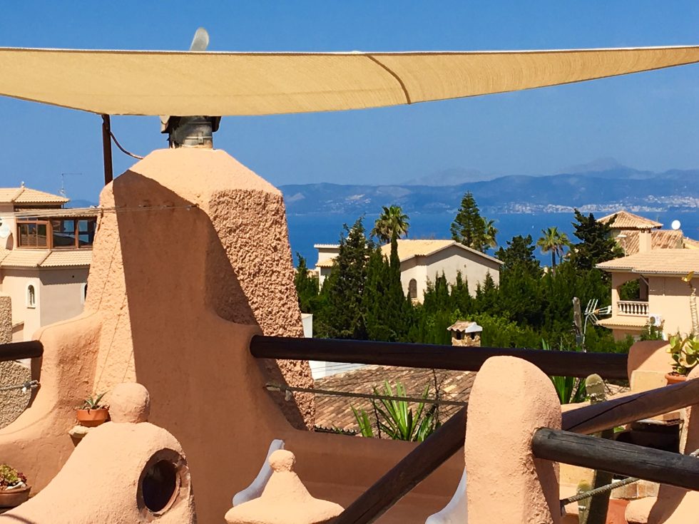 Desde el salón accedemos a la terraza solárium desde la que podemos admirar una amplia vista a la bahía y a la Sierra de Tramuntana.