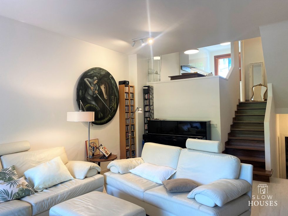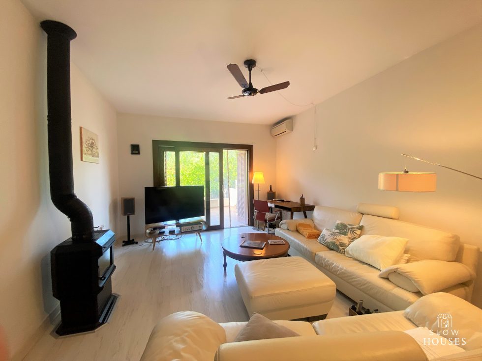 En la planta baja encontramos un amplio salón con estufa de leña y con acceso a la terraza y jardín con árboles frutales. Una cocina de diseño con vistas al salón y completamente equipada. Un cuarto de baño y un trastero.