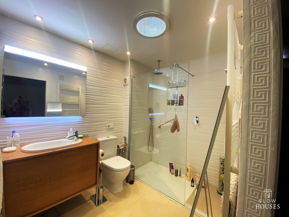 Tiene, además de la estufa de leña, aire acondicionado frío/calor. Las ventanas tienen triple cristal que contribuyen a que el aislamiento acústico y térmico sea impecable. En la zona del párquing hay un aparato de ósmosis para el agua de toda la casa.