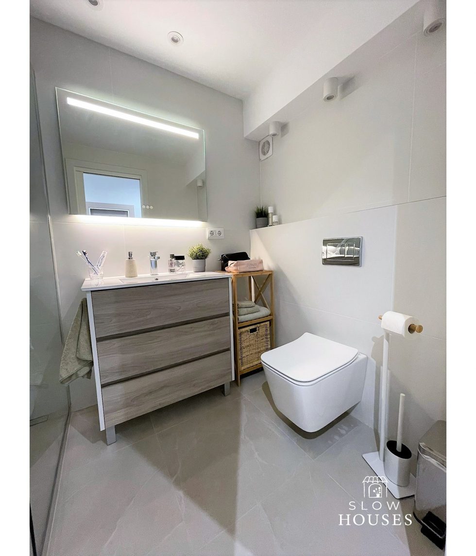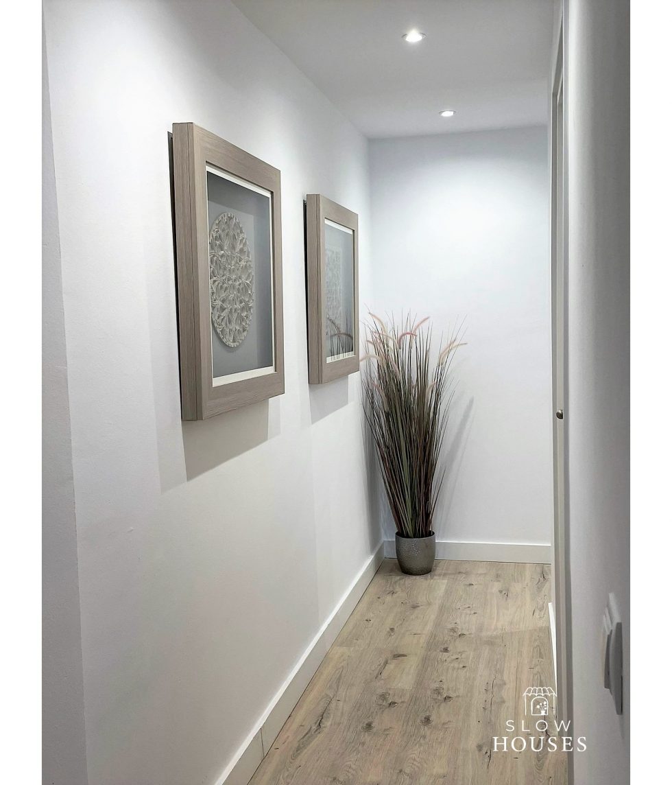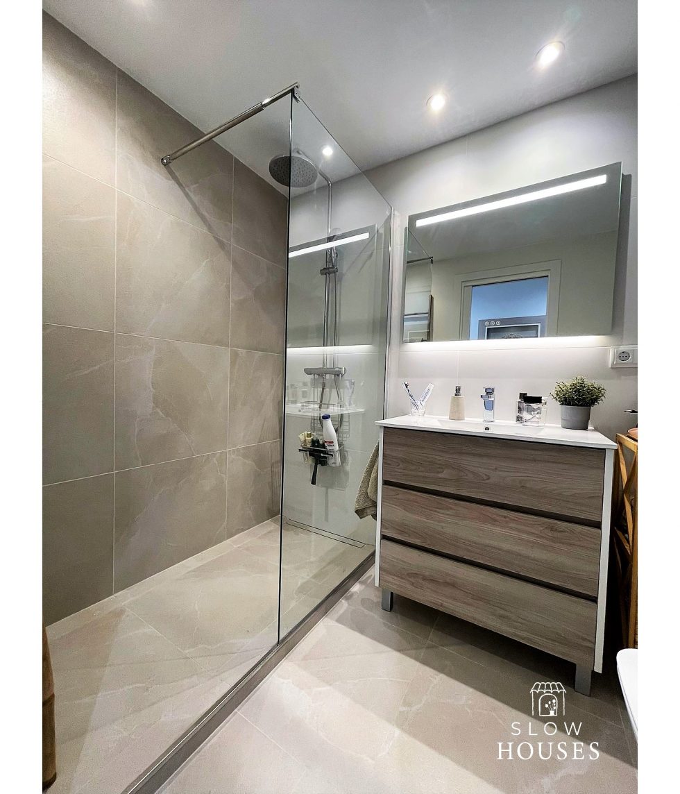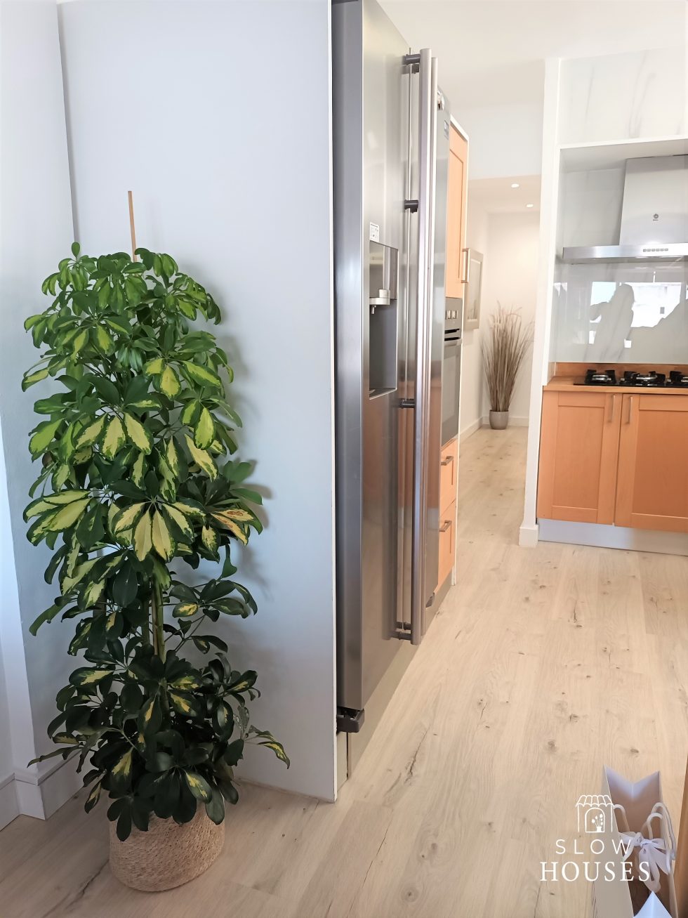 Al entrar, encontramos un pequeño vestíbulo con un armario empotrado. A su izquierda, aparece el salón con un gran ventanal y vistas despejadas hacía la Bahía de Palma. A la izquierda, está la preciosa cocina totalmente equipada.