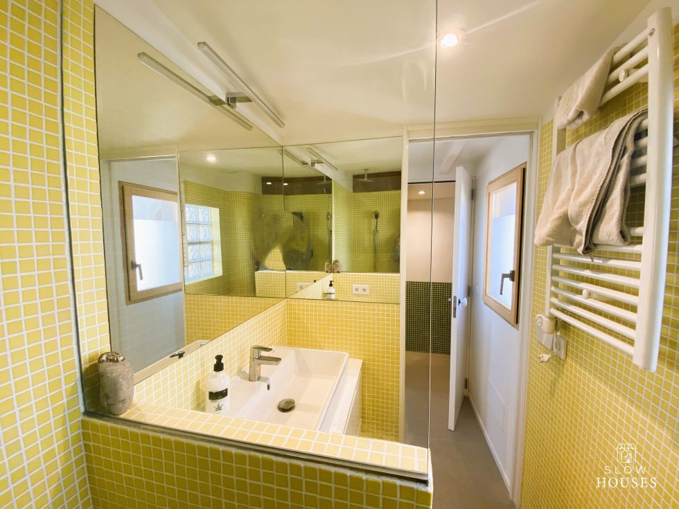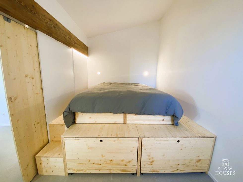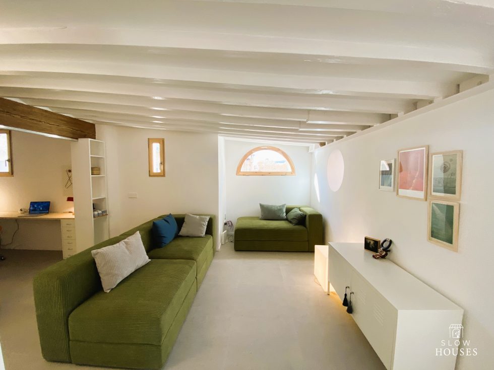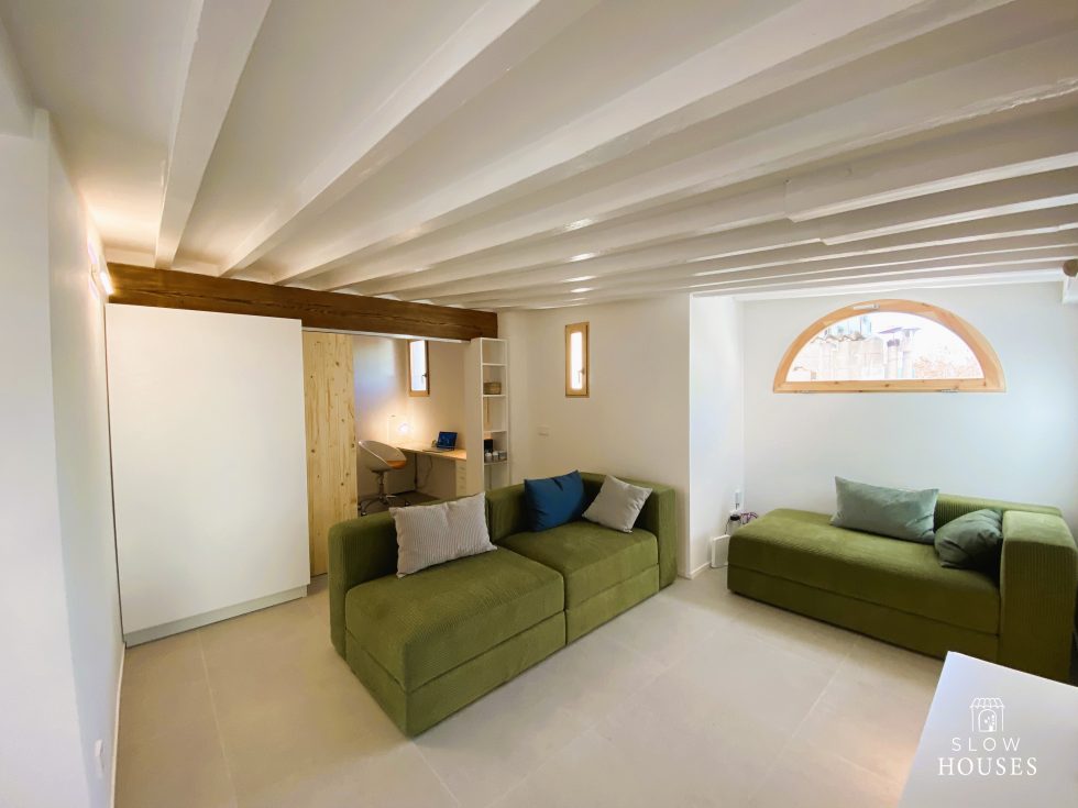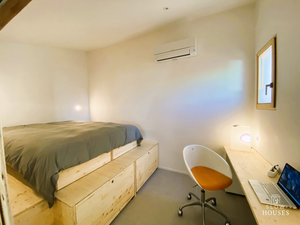Al fondo del salón, y separado por una puerta corredera, está el cómodo dormitorio y un pequeño office donde disponemos de una mesa de trabajo.