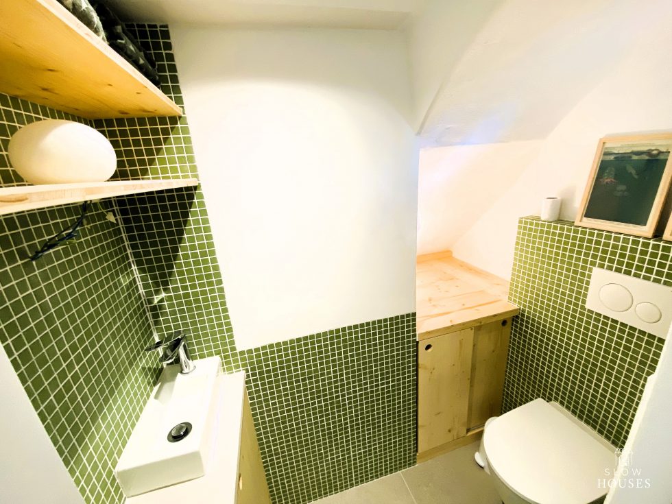 El precioso salón amueblado con dos amplios y cómodos sofás y con luz natural y en un lateral del salón encontramos el aseo y cuarto de baño.